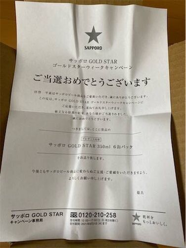 今度はサッポロ様よりサッポロゴールドスターが当選しました!