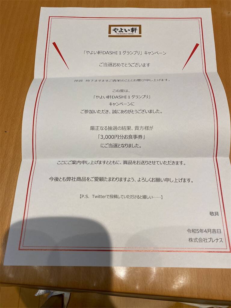 3000円分のお食事券が当たりました!
